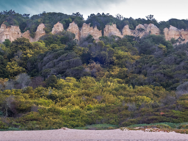 Mais à frente começo a notar que a arriba, até aqui pouco esculpida e até monótona, ganha cores e formas. Por uns momentos, quase me julgo algures no Bryce canyon, tamanha a beleza das formas e cores que as encostas de arenito, erodidas pelos ventos e chuvas, agora aqui assumem. Faço várias fotografias, deslumbrado com a descoberta e tomo uma nota mental de aqui um dia voltar com melhor equipamento fotográfico. O local, por certo, merece-o!