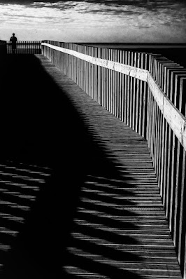 Um pequeno passadiço de madeira corre frente às traseiras do farol, para terminar numa plataforma miradouro. Alguém lá estava, banhado pela luz forte do sol que garantia ainda grandes e marcadas sombras. A oportunidade para uma boa fotografia, que não deixei escapar.